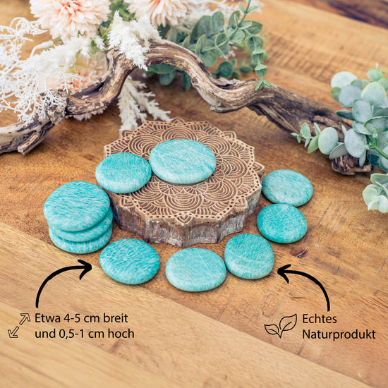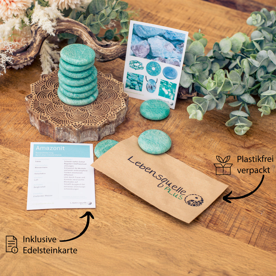 - Farbvielfalt: Der Amazonit-Scheibenstein präsentiert sich in einer Palette von grünen bis bläulichen Tönen, wobei jede Scheibe ein Unikat ist.