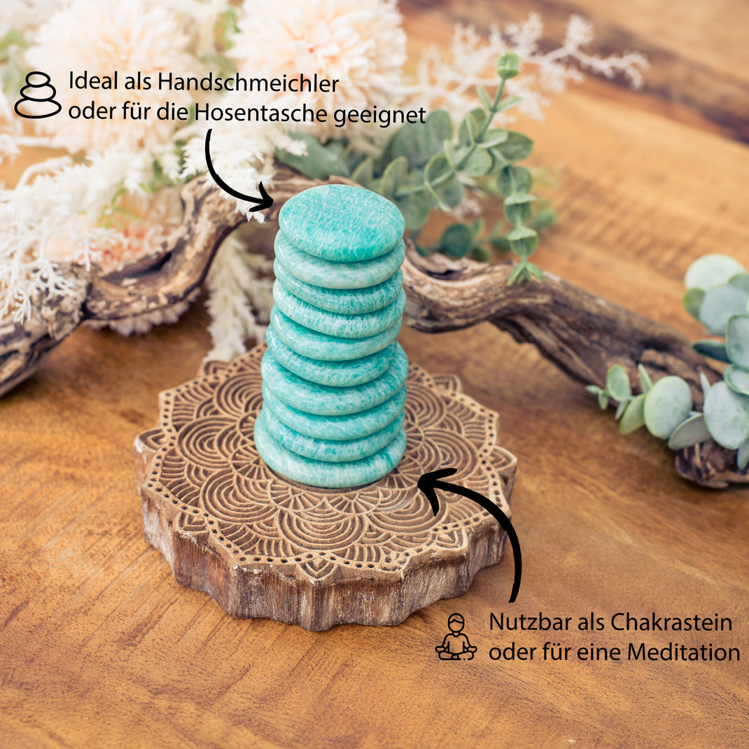 - Praktische Maße: Mit einem Durchmesser von 4-5 cm und einer Höhe von 1-2 cm ist der Stein ideal als Handschmeichler, Taschenstein, Meditationsstein oder für entspannende Massagen.