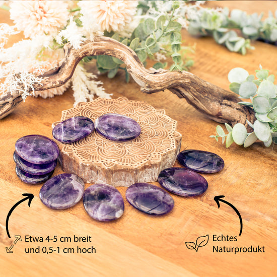 Visuelle Eigenschaften: Leuchtend violette Farbnuancen, durchzogen von natürlichen Linien und Einschlüssen, machen diesen Amethyst-Scheibenstein zu einem optisch beeindruckenden Objekt.