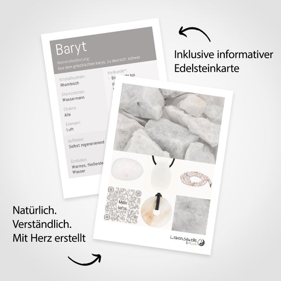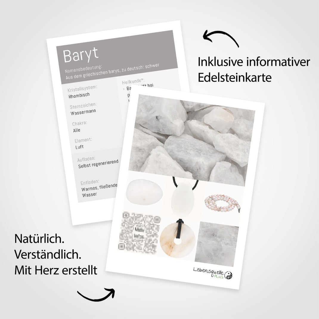 - Baryt Trommelstein : Der Baryt besticht durch seine hellen, cremeweißen Töne, oft durchzogen von zarten, natürlichen Mustern.