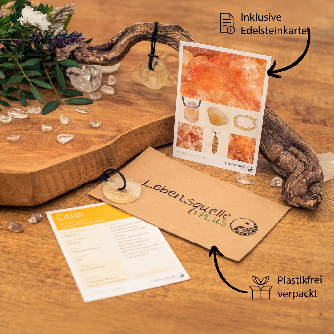 Inklusive Edelsteinkarte mit liebevoll gestalteten Informationen über die Eigenschaften und Symbolik des Citrins.
