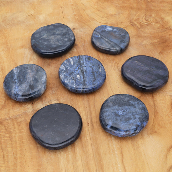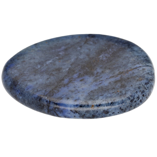 - Tiefblauer Dumortierit-Scheibenstein mit sanften Farbvariationen in Blau und leicht schimmernden Einschlüssen, die ihm eine beruhigende und edle Ausstrahlung verleihen.