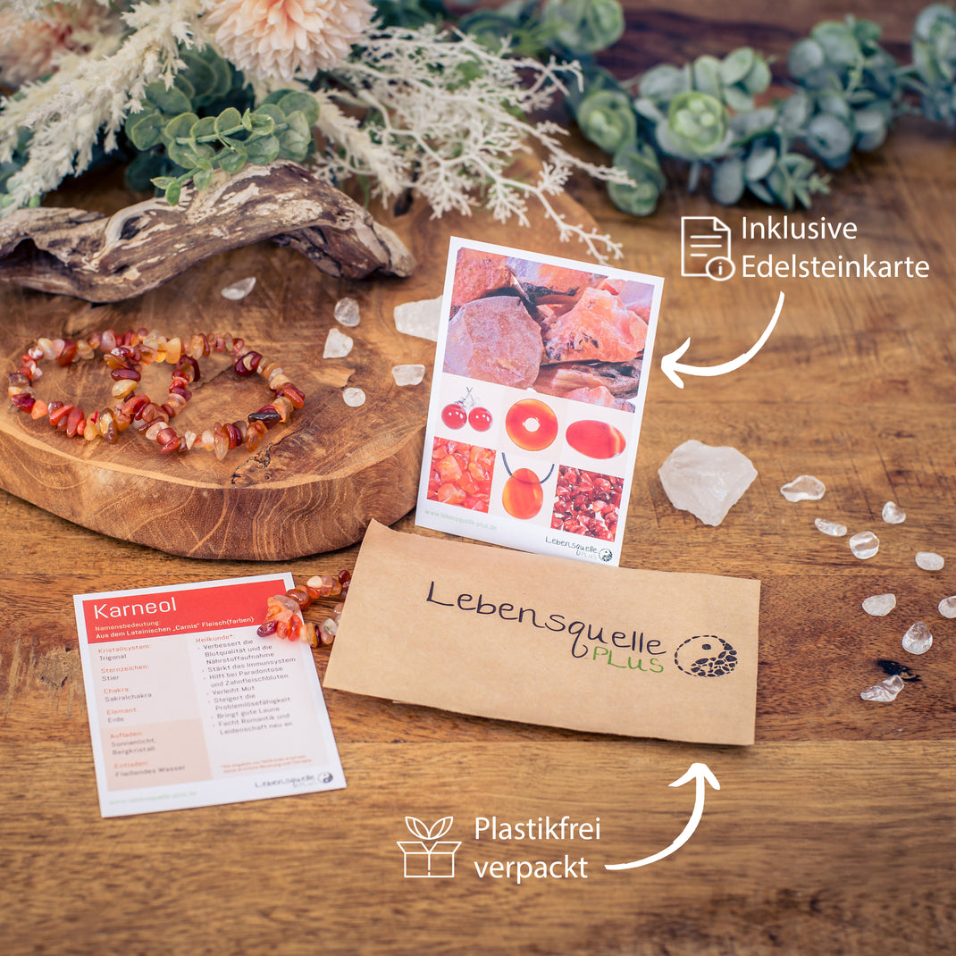 - Inklusive einer Edelsteinkarte: Eine liebevoll gestaltete Edelsteinkarte zum Karneol mit allen nützlichen Informationen zum Sternzeichen, Chakra und der nachgesagten Heilwirkungen ist ebenfalls enthalten