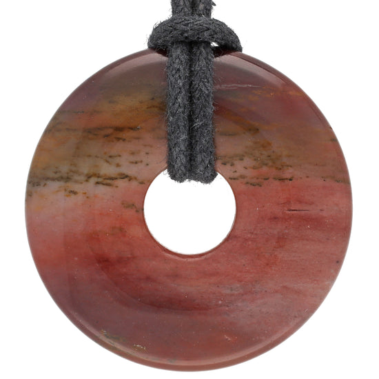 Mookait-Donut Ein wunderschöner Donut aus Mookait mit natürlicher Maserung in warmen Erdtönen. Das Set umfasst ein 100 cm langes schwarzes Baumwollband ohne Verschluss, das flexibel angepasst werden kann.