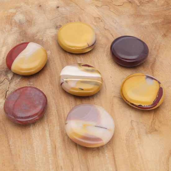 - Lebendige Farben des Mookaits: Diese Scheibensteine aus Mookait beeindrucken mit warmen Erdtönen wie Rot, Gelb und Beige, die jedem Stein eine einzigartige und lebendige Ausstrahlung verleihen.