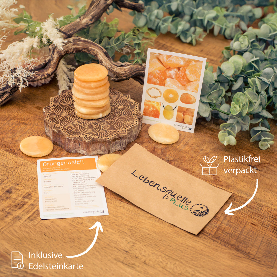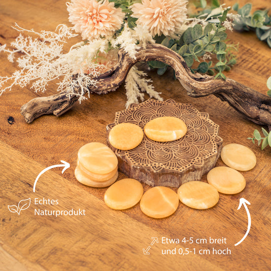 - Warmes Farbspektrum: Die Orangencalcit-Scheibensteine schillern in warmen Orange- und Cremetönen, die jedem Raum eine freundliche Atmosphäre verleihen.