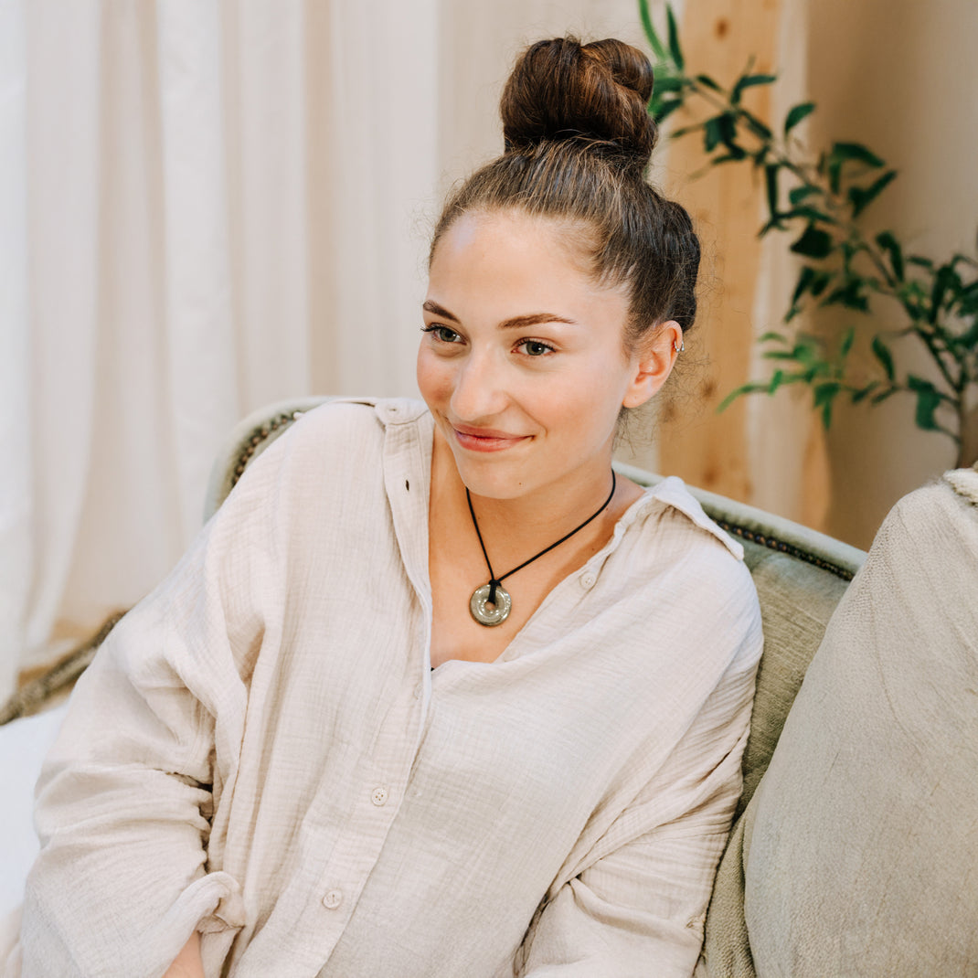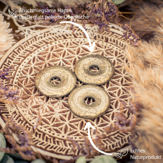 - Glatt polierte Oberfläche Der Donut ist sorgfältig geschliffen und poliert, sodass er sich angenehm an die Haut legt und den charakteristischen Glanz des Pyrits unterstreicht.