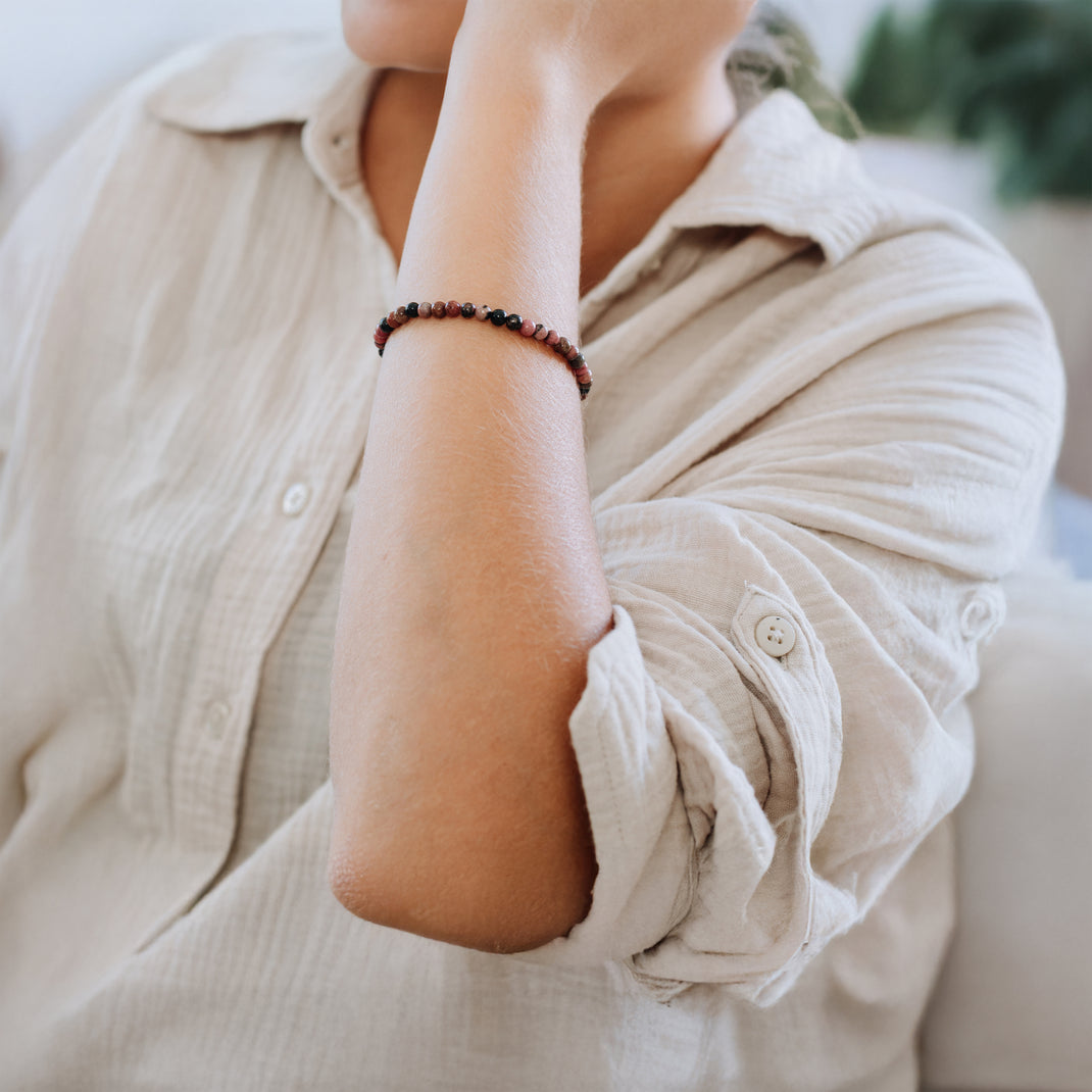 Mini Kugelarmband aus Rhodonit: Dieses Armband zeigt die einzigartige Farbgebung des Rhodonits, die durch seine warmen Rosa- und Schwarztöne hervorsticht und dem Schmuckstück eine natürliche Eleganz verleiht.