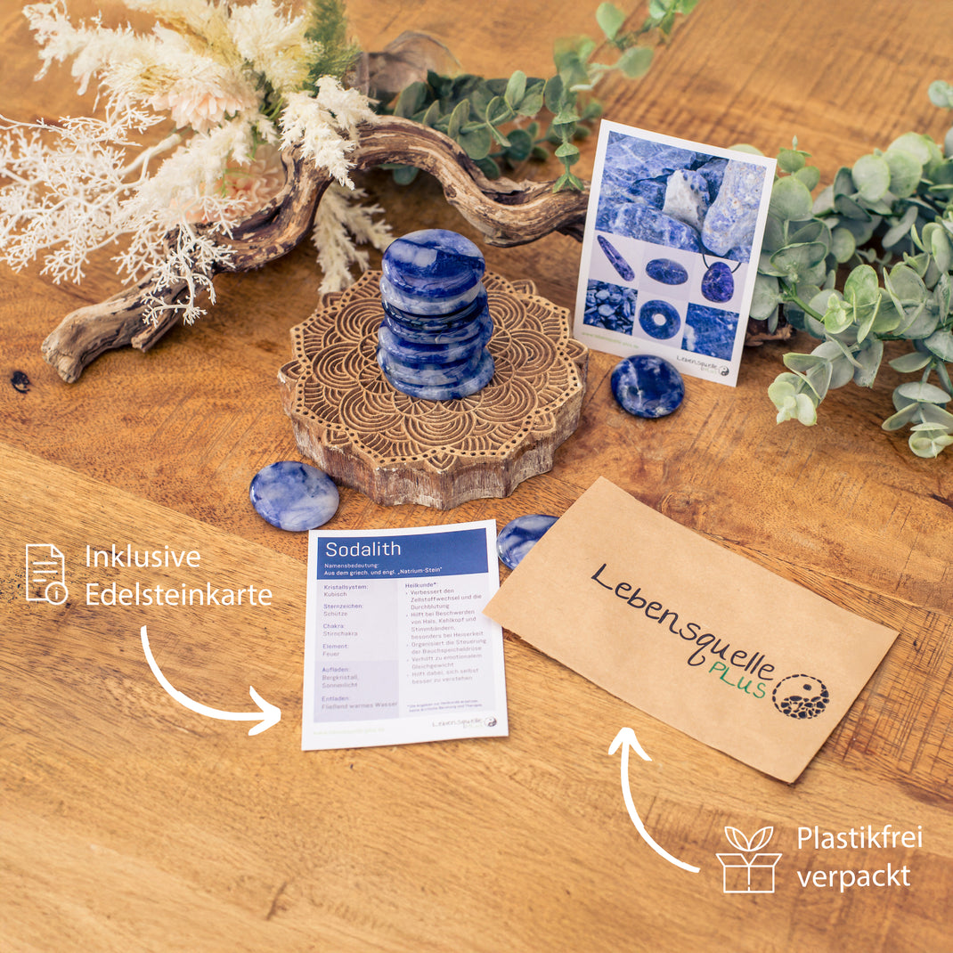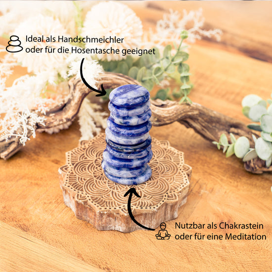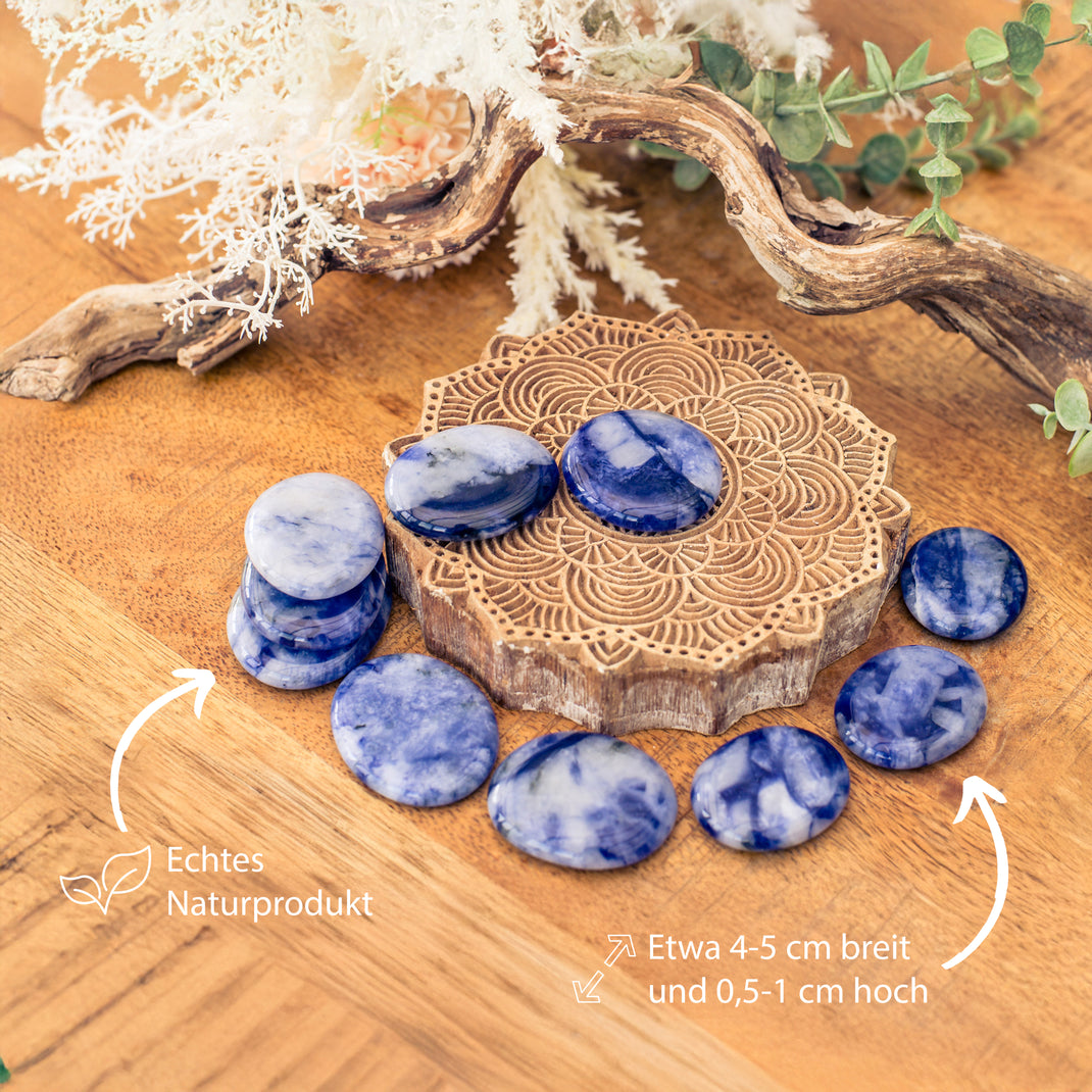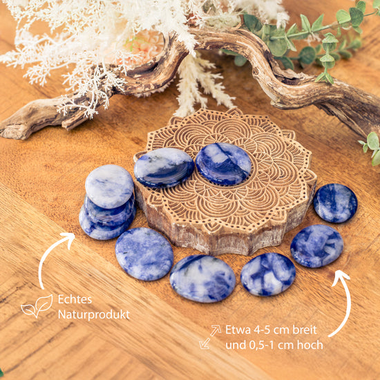 - Markante Farbgebung: Sodalith-Scheibensteine in tiefen Blautönen mit weißen Marmorierungen, die jedem Raum eine kühle Eleganz verleihen.