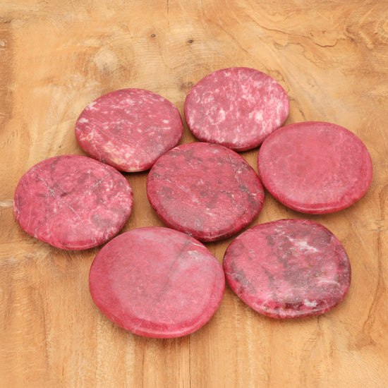 - Leuchtendes Rosa des Thulits: Diese flachen Scheibensteine aus Thulit strahlen in lebhaften Rosatönen, die dem Stein eine besonders einladende und harmonische Ausstrahlung verleihen.