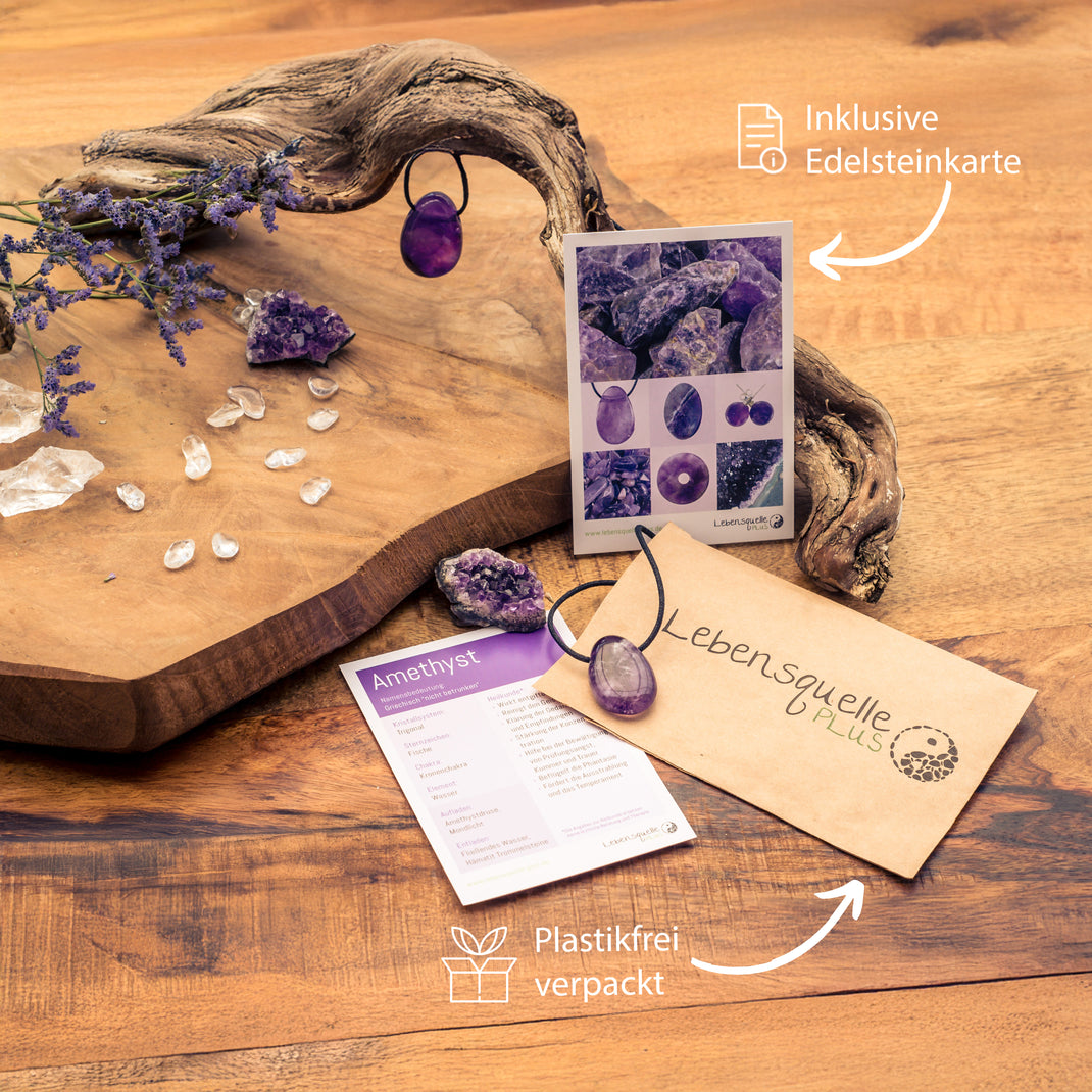 - Includes gemstone card with information on zodiac signs, chakras and healing effects of amethyst.