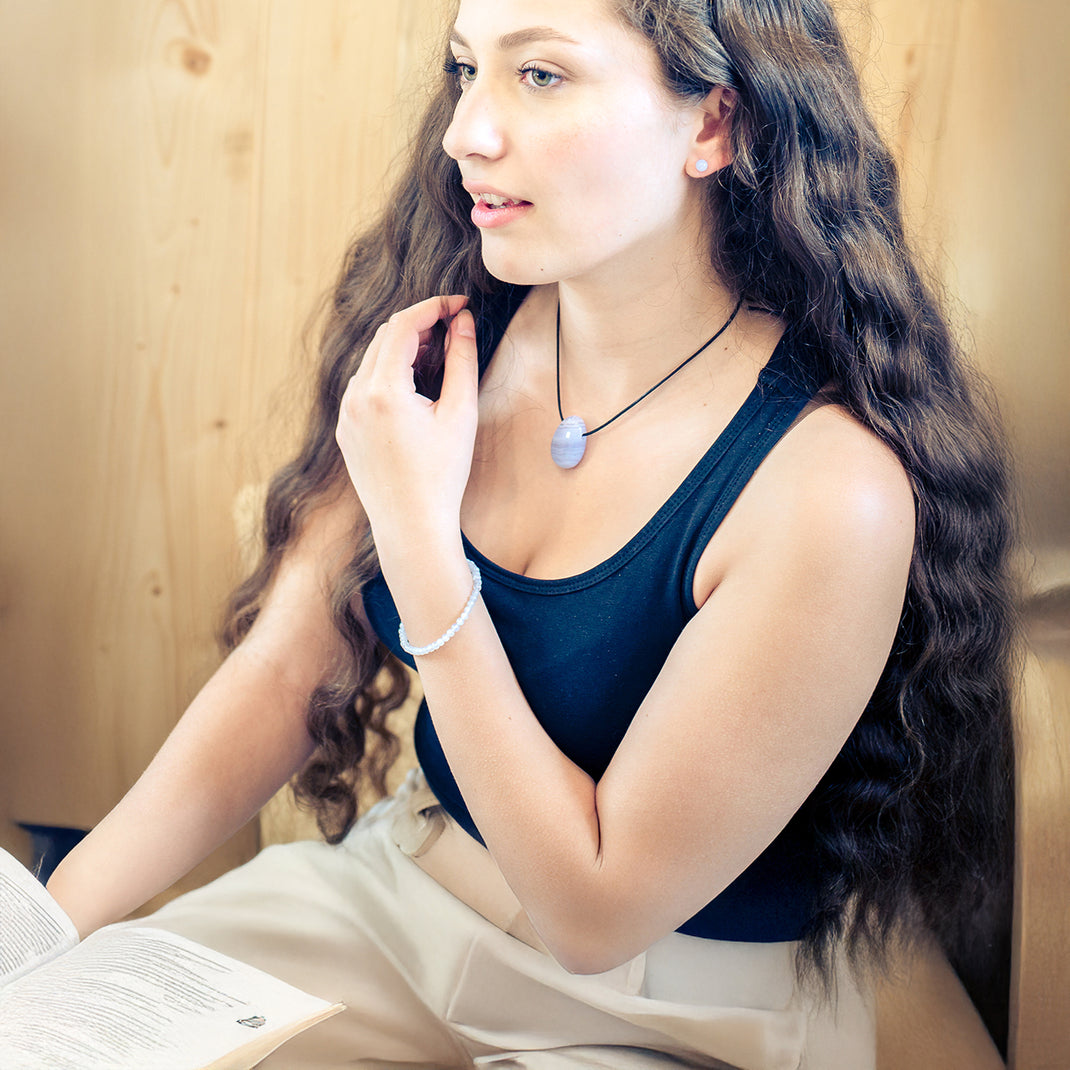 Versatile combinations: The delicate blue tone of the chalcedony goes perfectly with different outfits and can be ideally combined with other pieces of jewelry.
