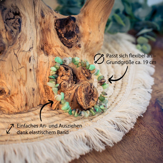 - Natural charm: This chip bracelet is a tribute to the raw beauty of nature, crafted from genuine chrysoprase tumbled stones, whose chips shine in a variety of green shades.