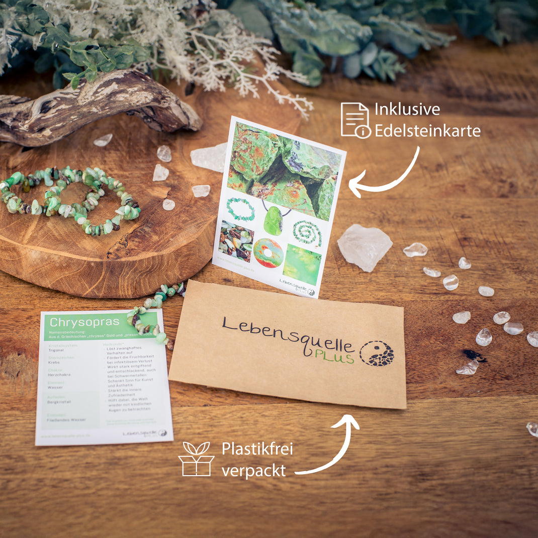 - Including a gemstone card: A lovingly designed gemstone card for Chrysoprase with all useful information about the zodiac sign, chakra and the alleged healing effects is also included.