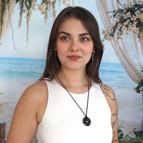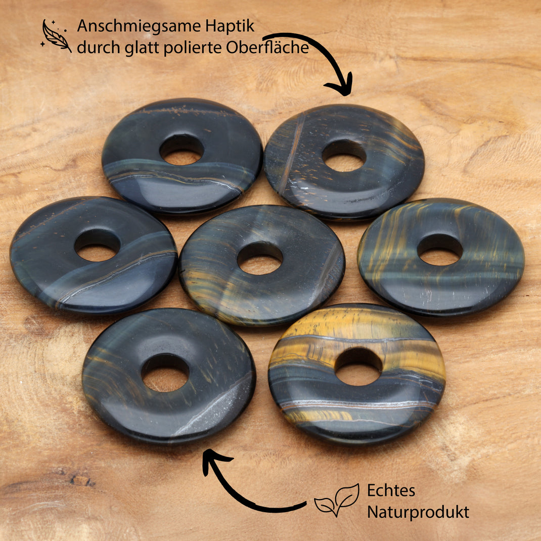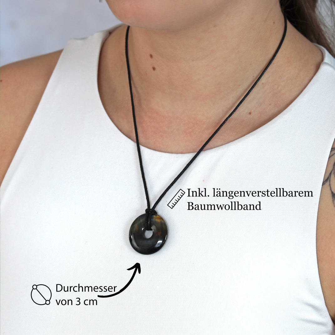 Hawk's Eye Donut: A sophisticated donut made of shimmering hawk's eye with mesmerizing blue-black reflections. The set includes a 100 cm long black cotton cord without a clasp, perfect for flexible wearing options.