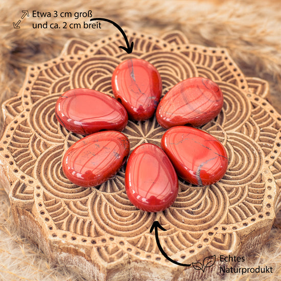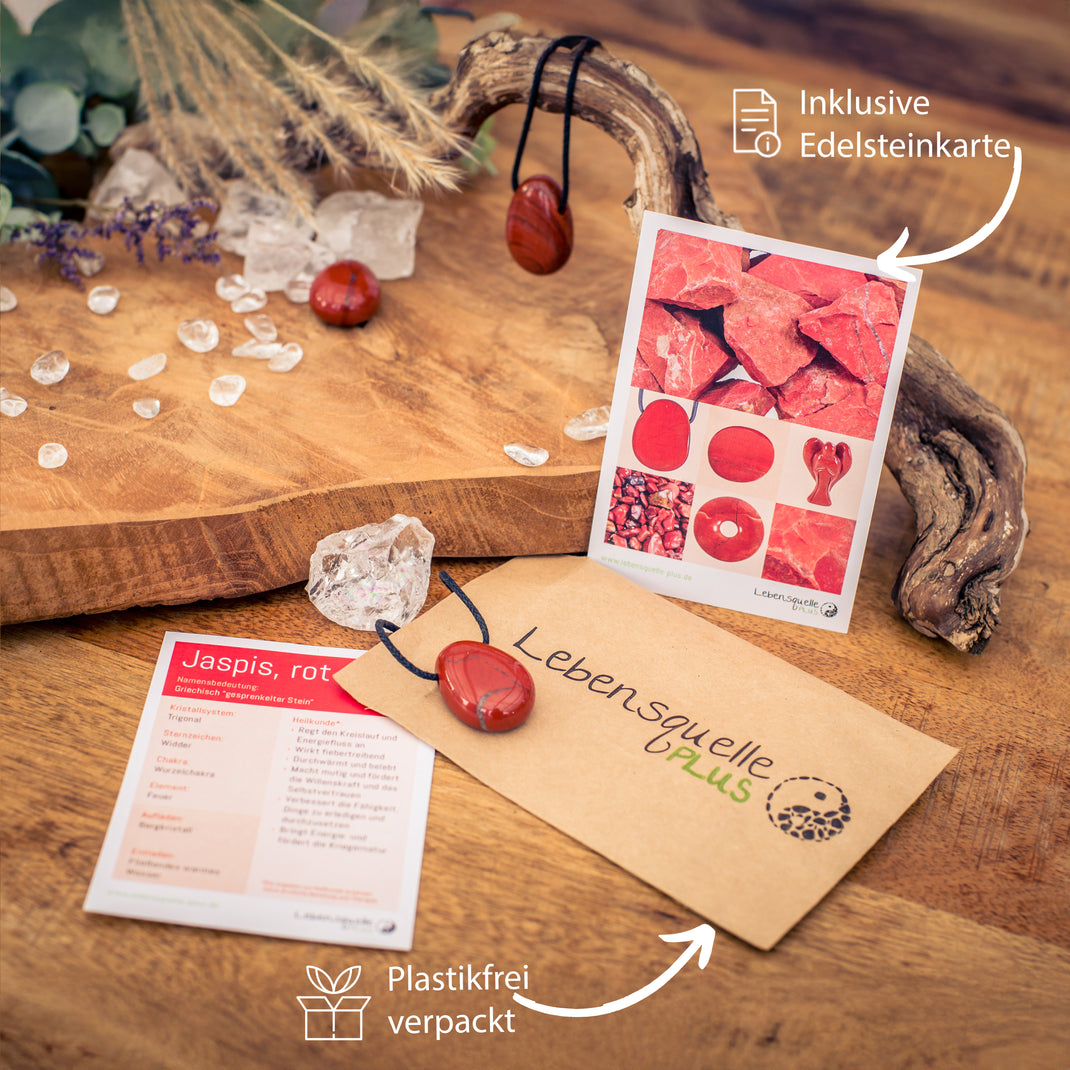 - Includes a gemstone card . A lovingly designed gemstone card for red jasper with all the useful information about the zodiac sign, chakra, and purported healing properties is also included.