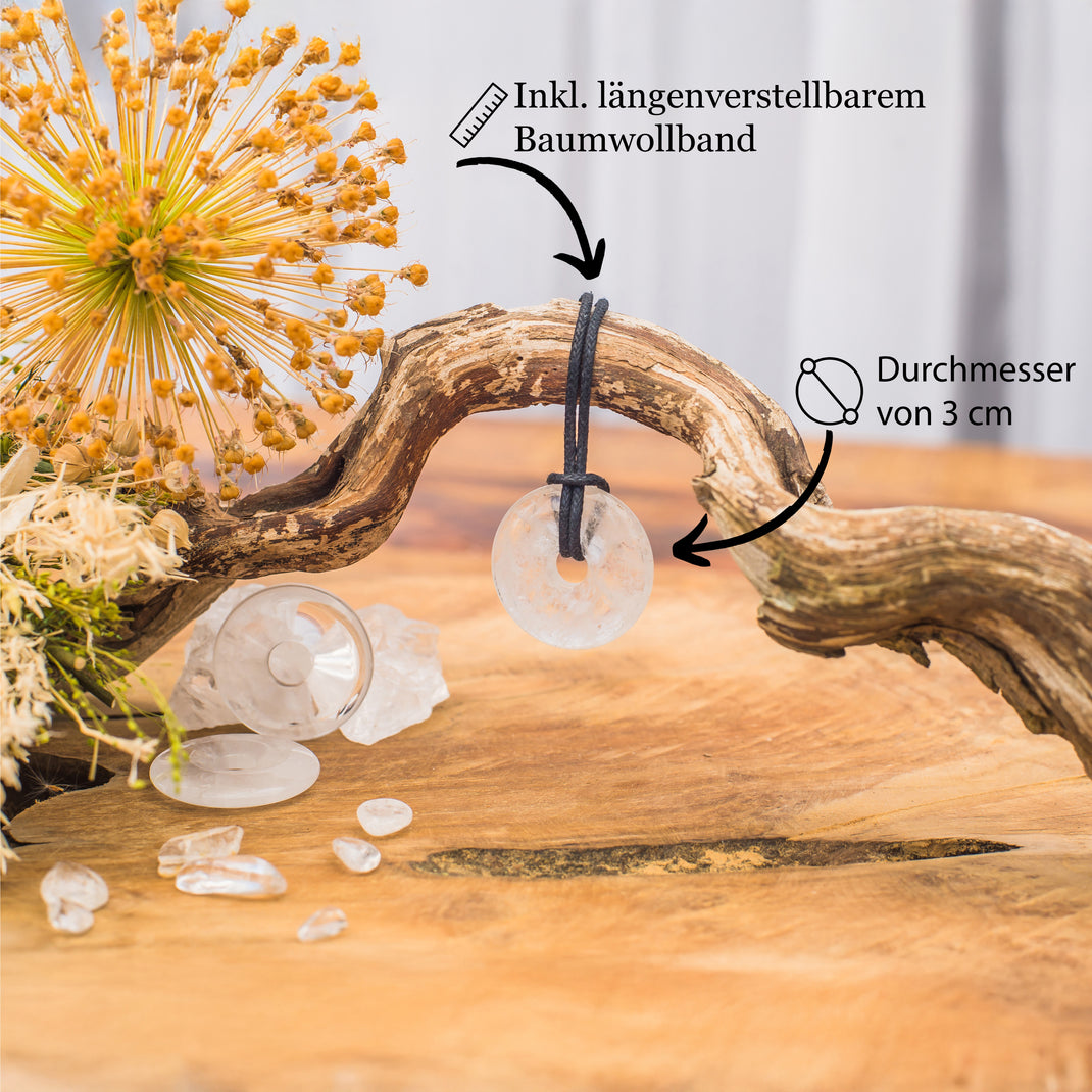 - Beautiful rock crystal donut with a diameter of 30 mm, made of clear, high-quality rock crystal, gives the wearer an elegant and pure radiance.