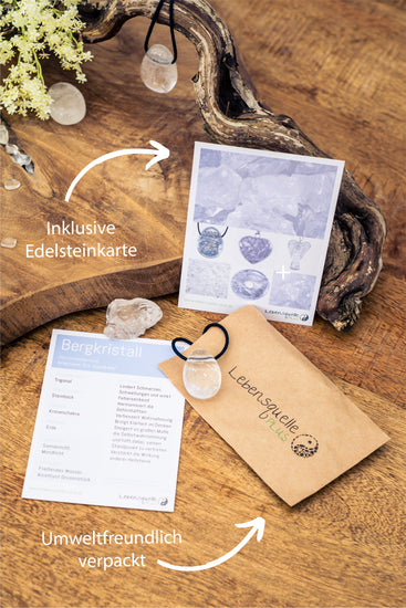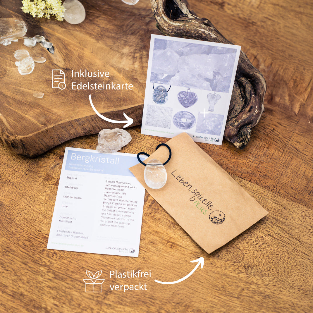 - Includes a gemstone card . A lovingly designed gemstone card for rock crystal with all the useful information about the zodiac sign, chakra, and purported healing properties is also included.