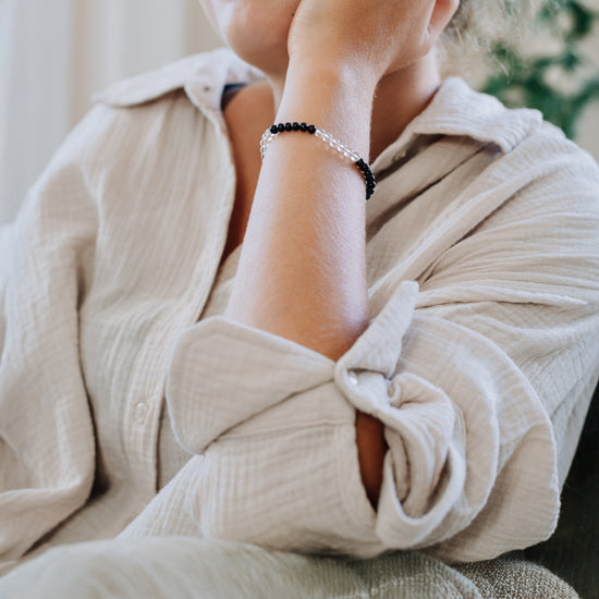 Mini ball bracelet made of rock crystal and black tourmaline: This elegant bracelet combines the clarity of rock crystal with the deep, protective energy of black tourmaline, giving the wearer a stylish and powerful aura.