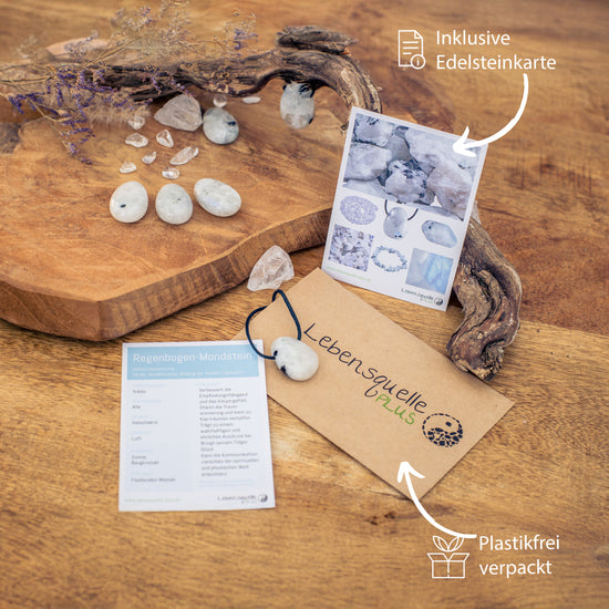 - Includes a gemstone card . A lovingly designed gemstone card for the rainbow moonstone with all the useful information about the zodiac sign, chakra, and purported healing properties is also included.
