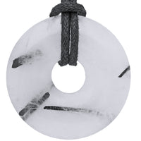 Tourmaline Quartz Donut The tourmaline quartz donut captivates with its fascinating combination of clear quartz and black tourmaline inclusions. The set includes a 100 cm long black cotton cord without a clasp, which is flexibly adjustable and ready to wear—a wonderful gift for gemstone lovers.